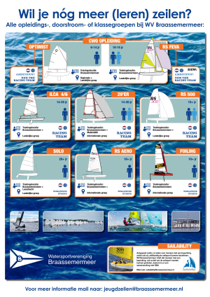 Een van onze belangrijkste doelstellingen is het bevorderen van van het wedstrijdzeilen door de jeugd. In onze beleving gaan plezier, passie en prestatie hand in hand en we streven ernaar om jouw talenten optimaal te ontwikkelen. Daarom hebben we een aantal teams onder de naam Racing Team Braassemermeer (RTB) opgericht. Binnen deze teams krijgen enthousiaste zeil(st)ers de gelegenheid om te trainen onder professionele begeleiding van professionele trainers en zeilers uit de top. Deze trainers werken gericht aan de ontwikkeling van de zeiltalenten van deze zeil(st)ers.